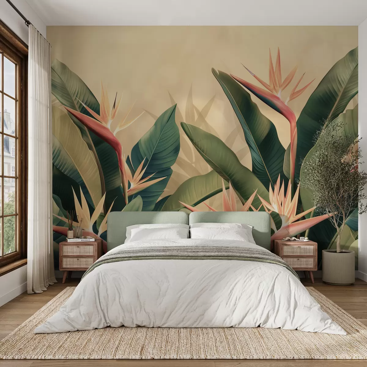 Fototapety Svěží aranžmá tropických květin obklopených velkými tmavě zelenými listy Č. w01484v1