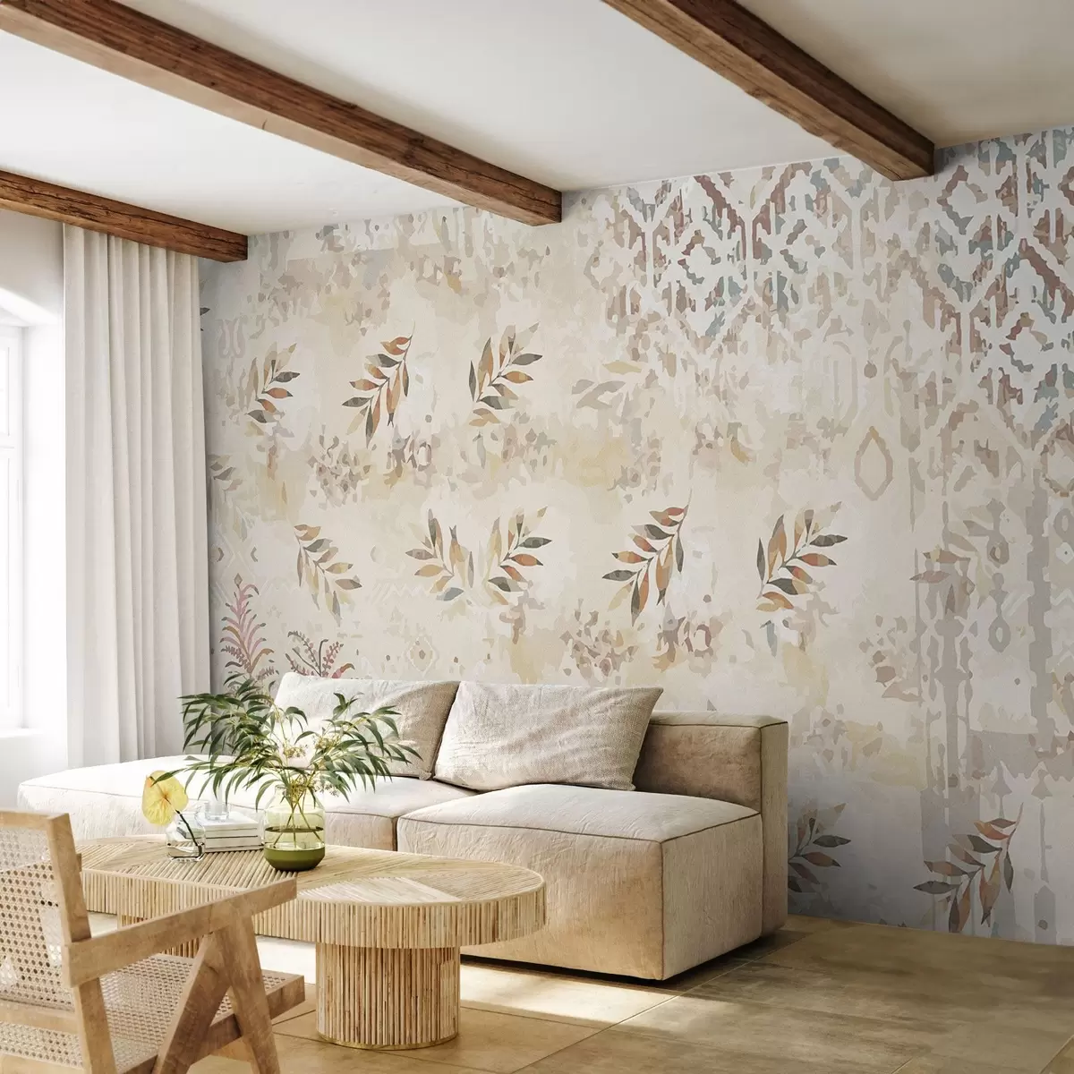 Fototapety tapety v retro stylu se vzory, prvky oděru, skvrnami a listy, v béžových barvách Č. w01955