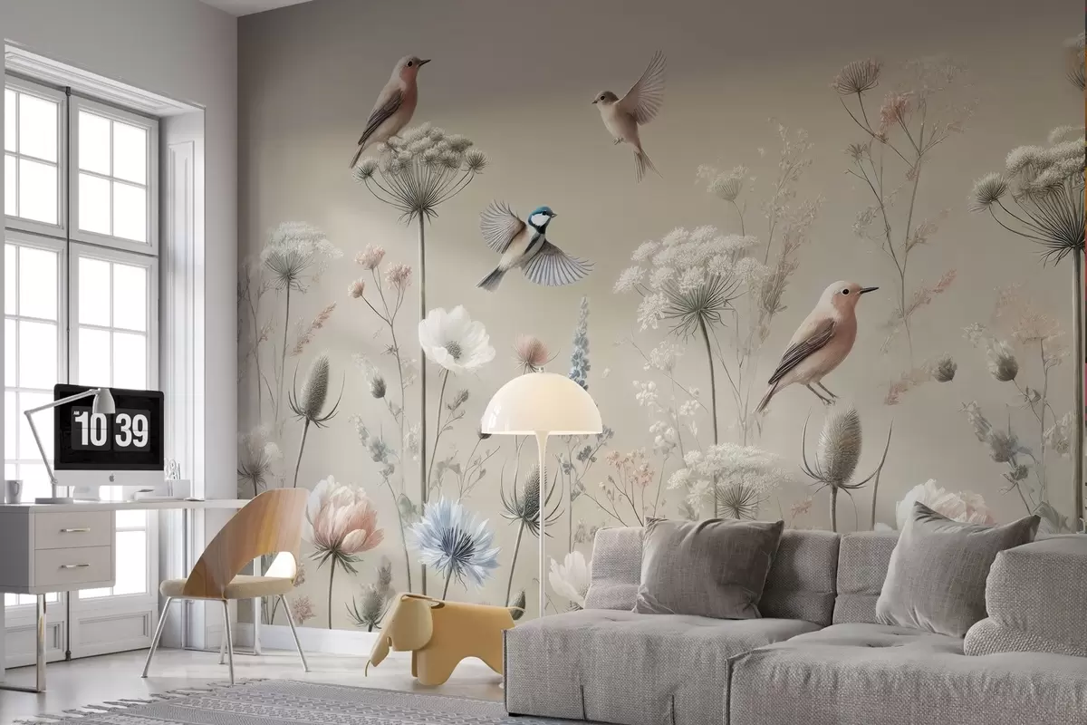 Fototapety Jemné polní květiny s ptáky na béžovém pozadí Č. w01958