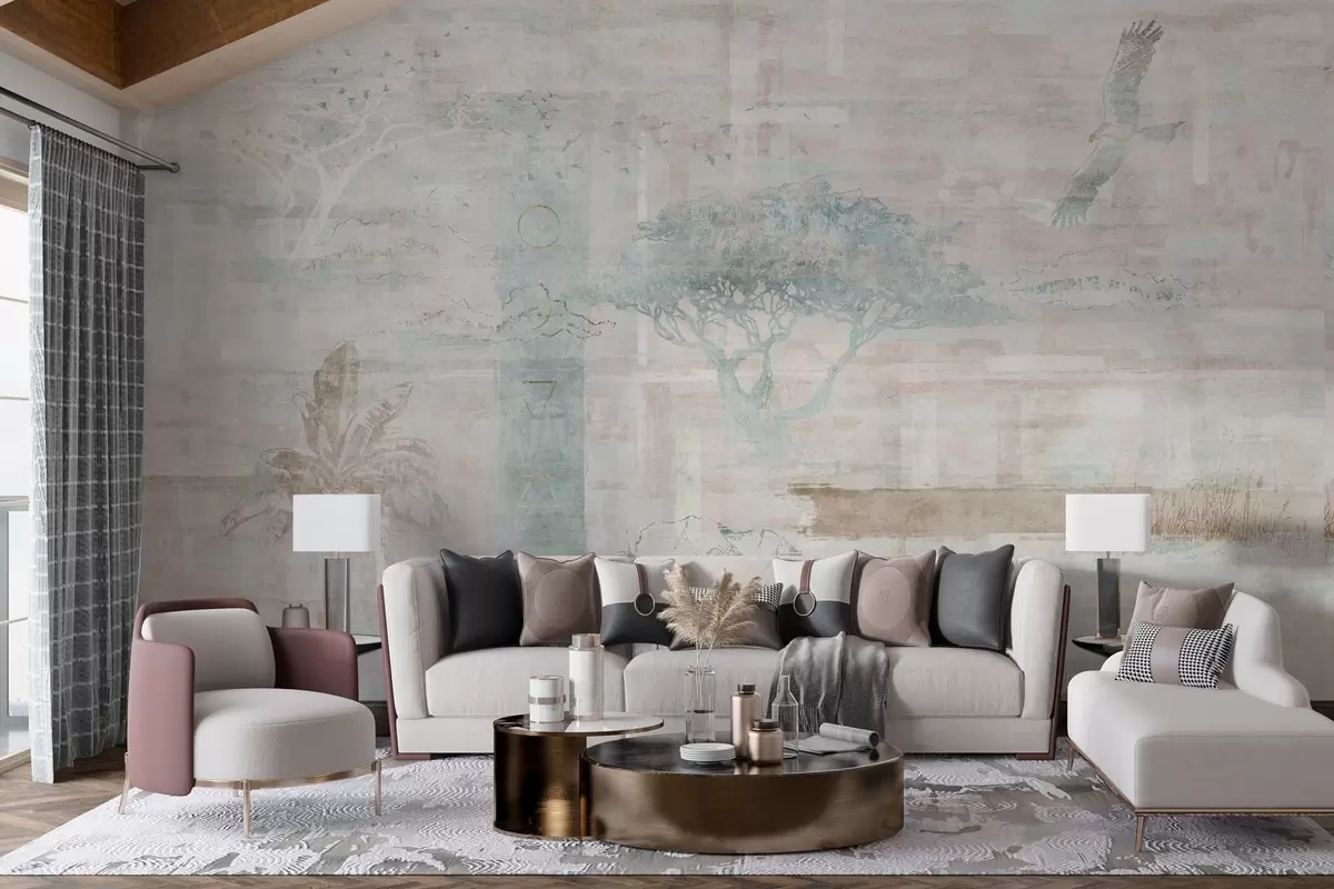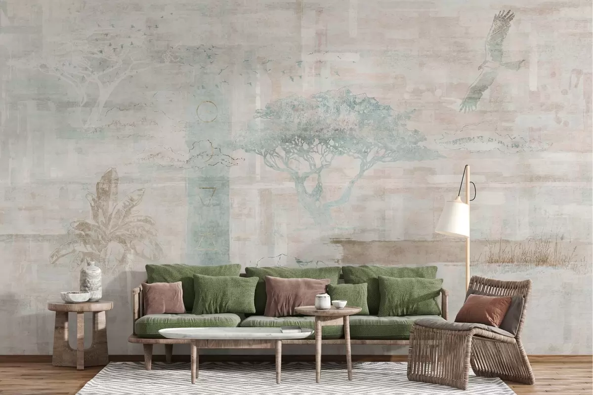 Fototapety Vintage design s efektem grunge se stromy, orlem a geometrickými prvky Č. w02130