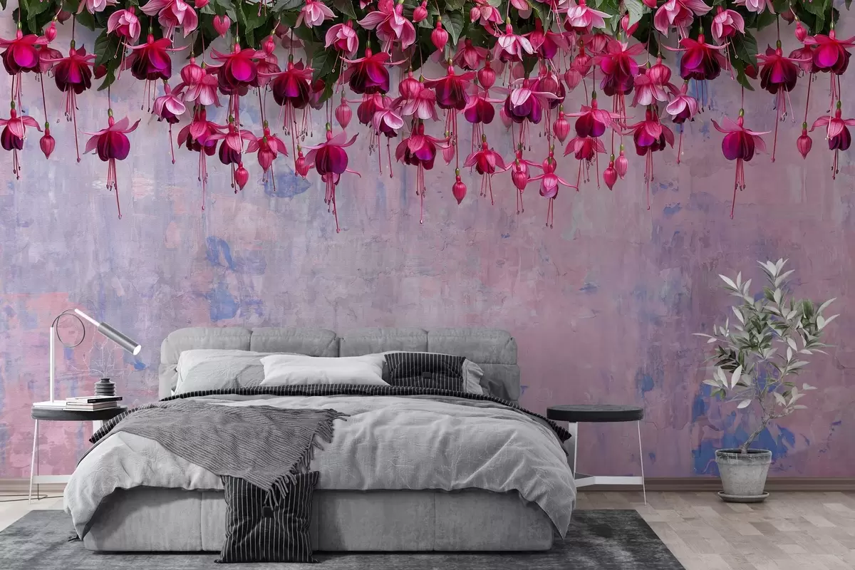 Fototapety Velké fuchsiové květy visící shora na pozadí retro zdi s imitací odřenin Č. w02132