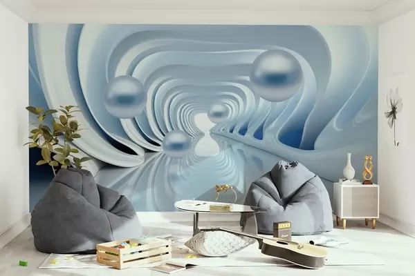 Fototapety Futuristická tapeta s panoramatem tunelu v perspektivě a létajícími perlami Č. w02134