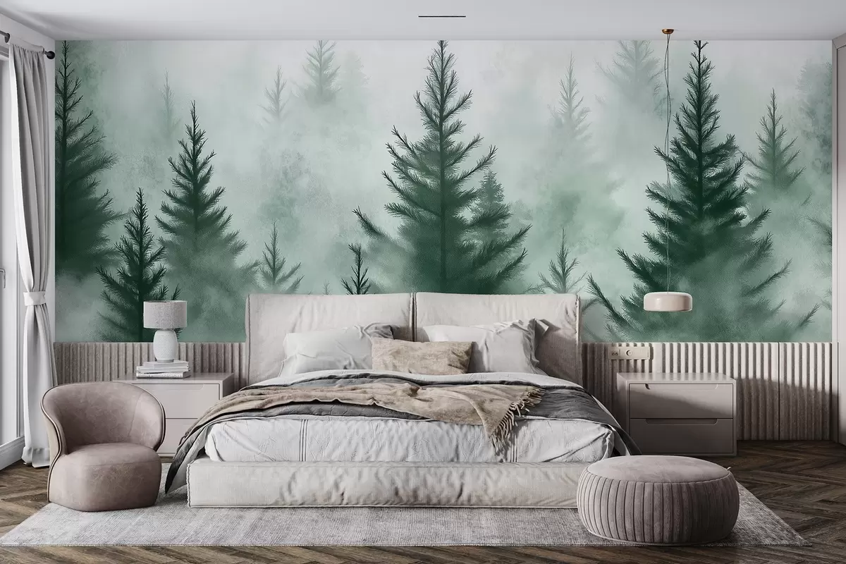 Fototapety Les v mlze, borovice, akvarel, zelené barvy Č. w02152v1
