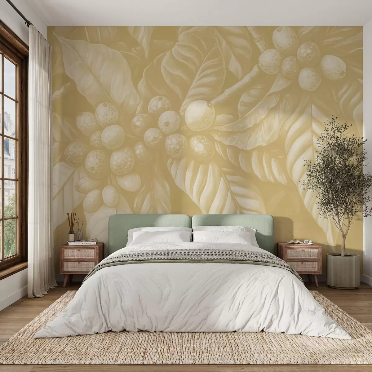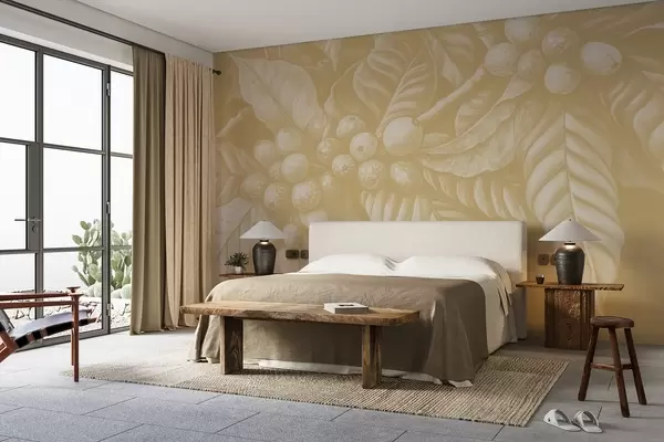 Fototapet Větve kávovníku s plody a tropickými prvky v béžových odstínech w02209v1