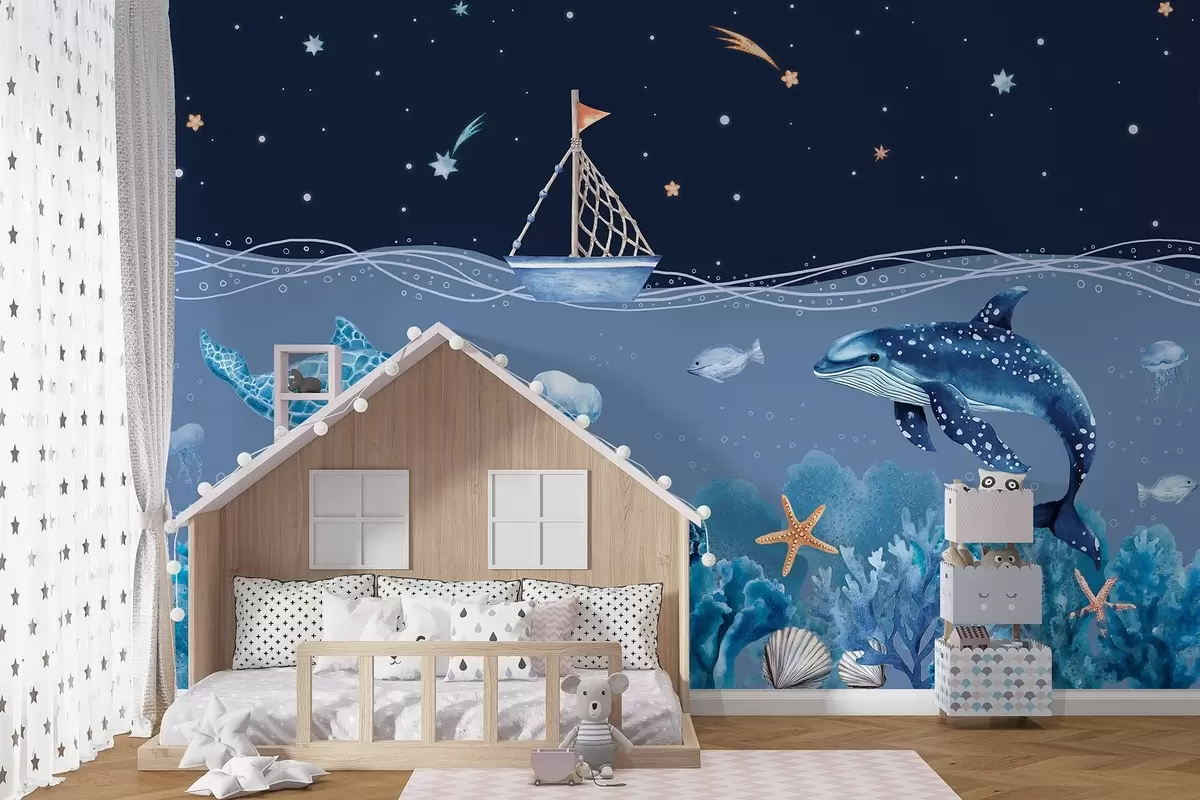 Fototapety Mořský život, akvarel styl, korály, loď, delfín, medúzy, hvězdná noční obloha, modré barvy Č. w02310