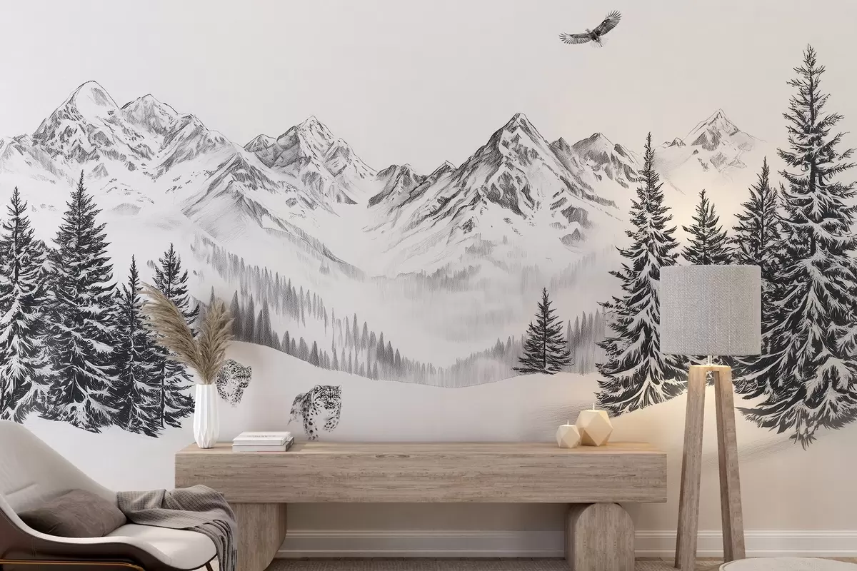 Fototapet Zimní hory, sněžní levharti, borový les, kresba tužkou, letící orel w02360