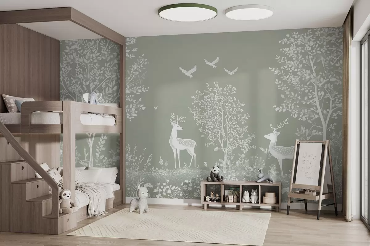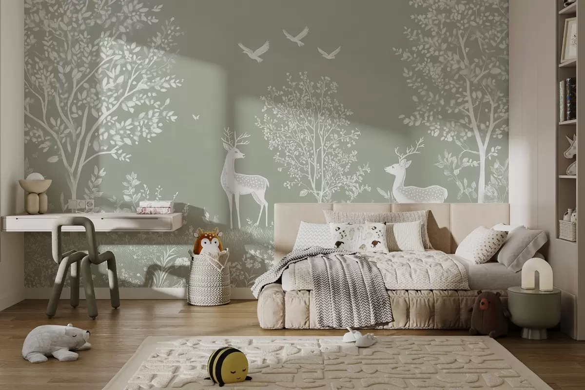 Fototapety les s jeleny ve stylu křídové kresby na olivovém pozadí Č. w02444v1