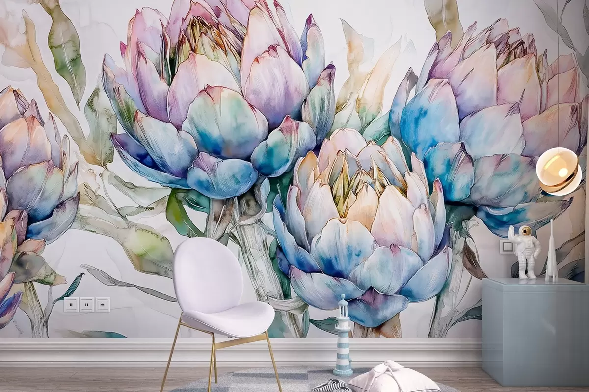 Fototapety Kresba artyčoků, akvarelový styl, květinová, fialová, béžová, zelená Č. w02484