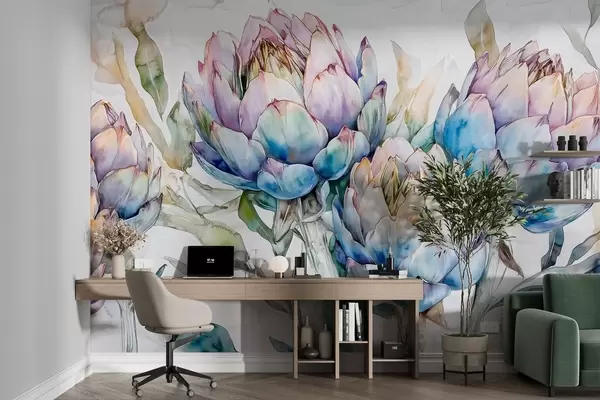 Fototapety Kresba artyčoků, akvarelový styl, květinová, fialová, béžová, zelená Č. w02484