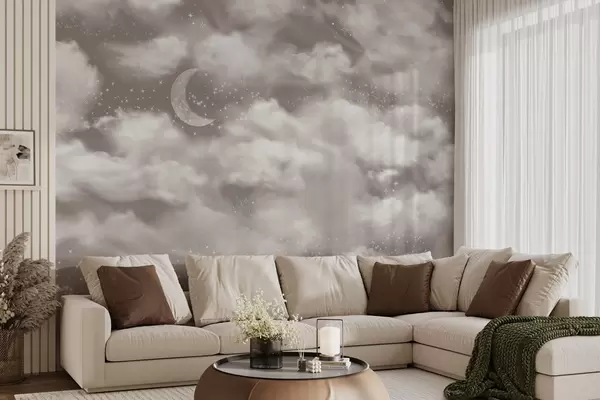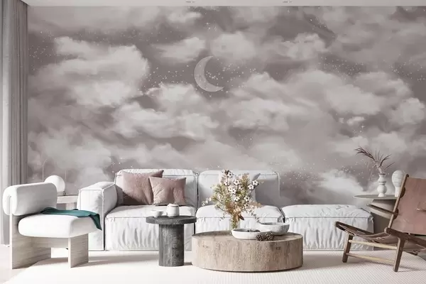 Fototapety Hvězdné nebe s měsícem a mraky, zasněné, éterické, jemné béžové barvy Č. w02515