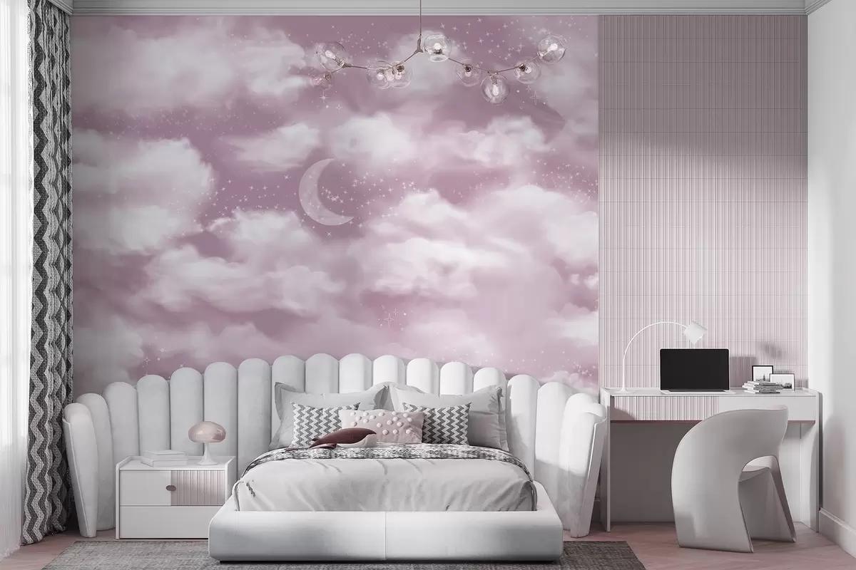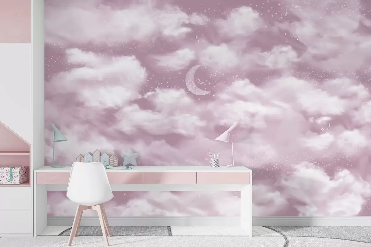 Fototapety Hvězdné nebe s měsícem a mraky, zasněné, éterické, jemné růžové barvy Č. w02515v3