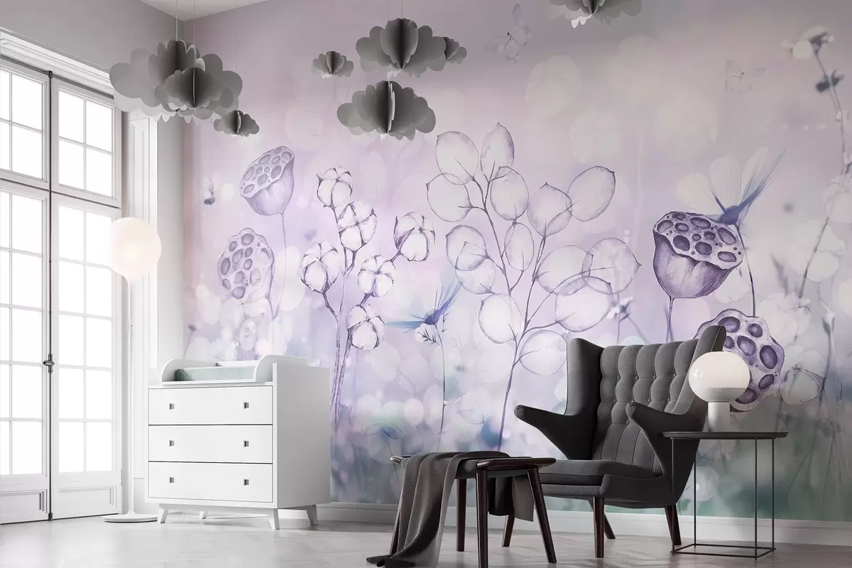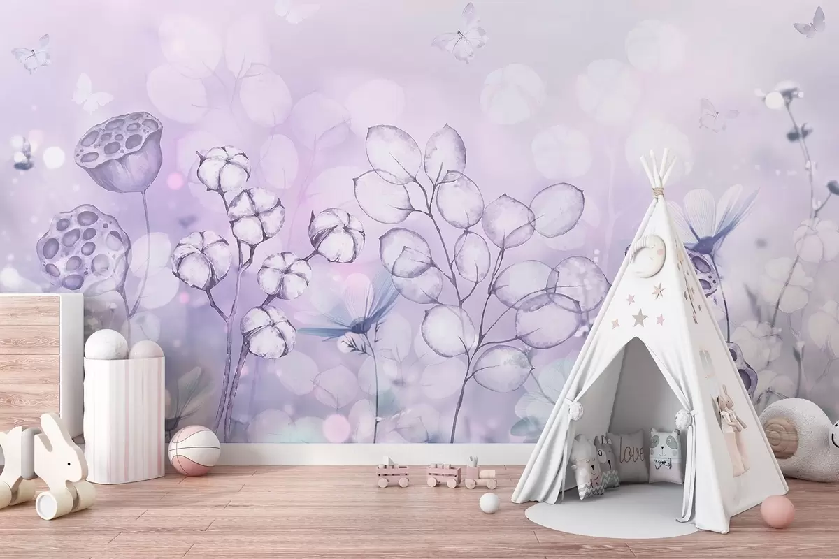Fototapety Zasněná květinová zahrada, motýl, bavlněné květy, lotosy, fialové barvy Č. w02516v1