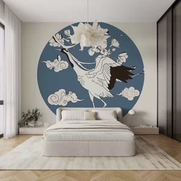 Fototapety Kresba v kruhu, květiny, mraky v japonském stylu, jeřáb, modrá část Č. w02538