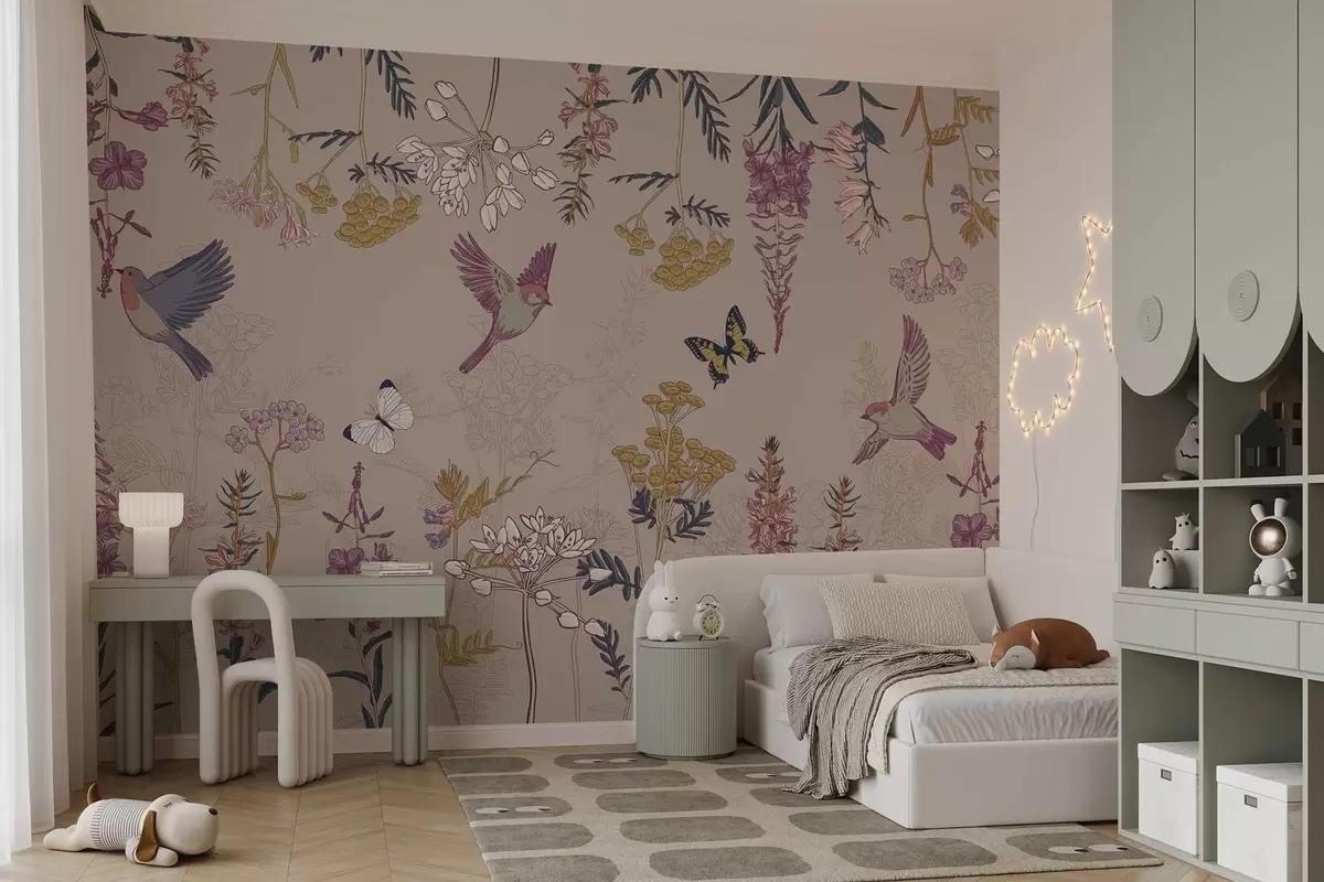 Fototapety soubor divokých květin a ptáků na béžovém pozadí Č. w02634