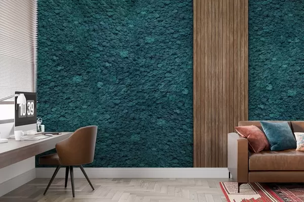 Fototapety Stěna v mechovém stylu s dřevěným panelem, svěží modré barvy Č. w02656v2
