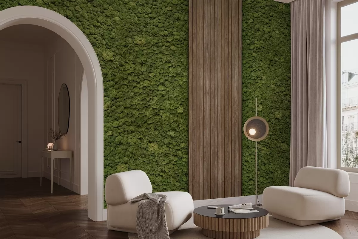 Fototapety Stěna v mechovém stylu s dřevěným panelem, svěží olivové barvy Č. w02656v3