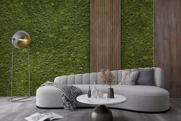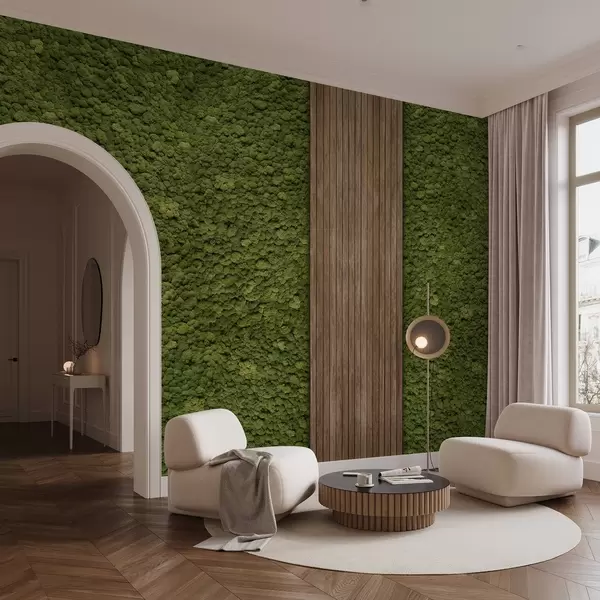 Fototapety Stěna v mechovém stylu s dřevěným panelem, svěží olivové barvy Č. w02656v3