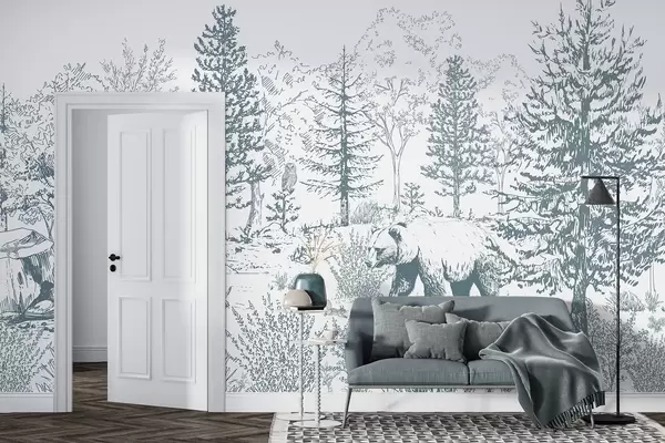 Fototapety Život v lese, stromy, divoká zvířata, medvěd, liška, sova, keře, kresba tužkou, modré barvy Č. w02929v1