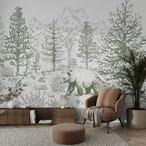 Fototapety Život v lese, stromy, divoká zvířata, medvěd, liška, sova, keře, kresba tužkou, zelené barvy Č. w02929v2