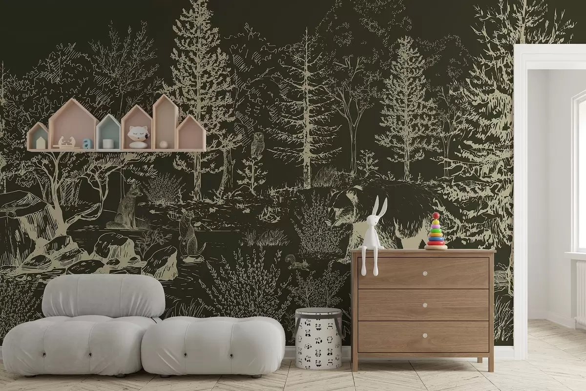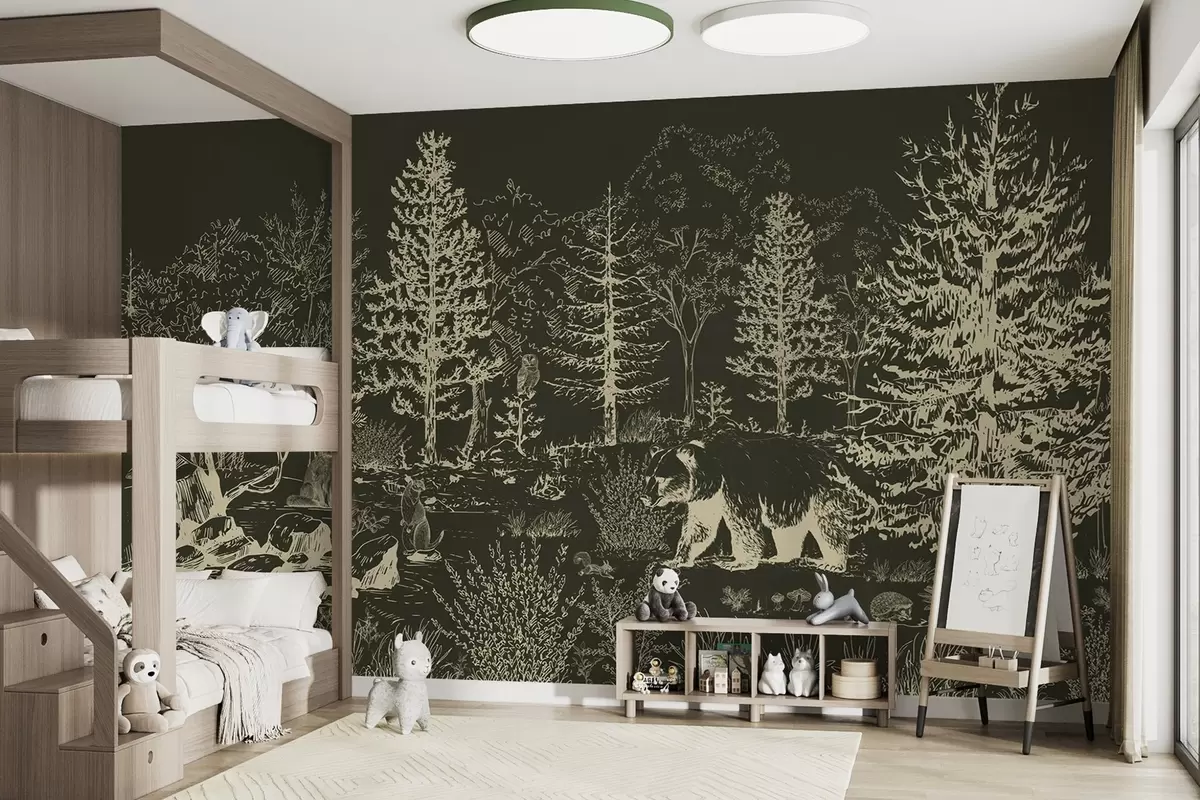 Fototapety Život v lese, stromy, divoká zvířata, medvěd, liška, sova, keře, tmavě zelené pozadí Č. w02929v3