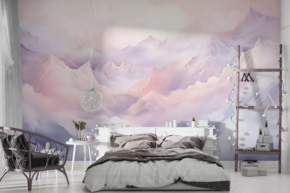 Fototapety Éterické hory s mraky, akvarelový styl, jemné fialové a růžové barvy Č. w02943