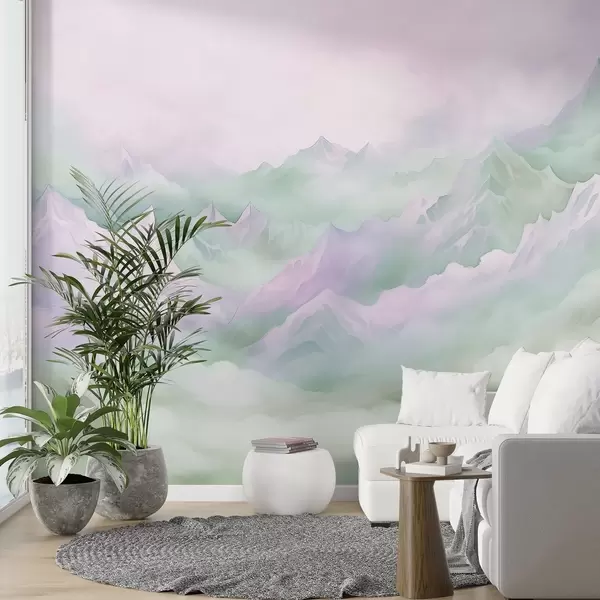 Fototapety Éterické hory s mraky, akvarelový styl, jemné zelené a růžové barvy Č. w02943v1
