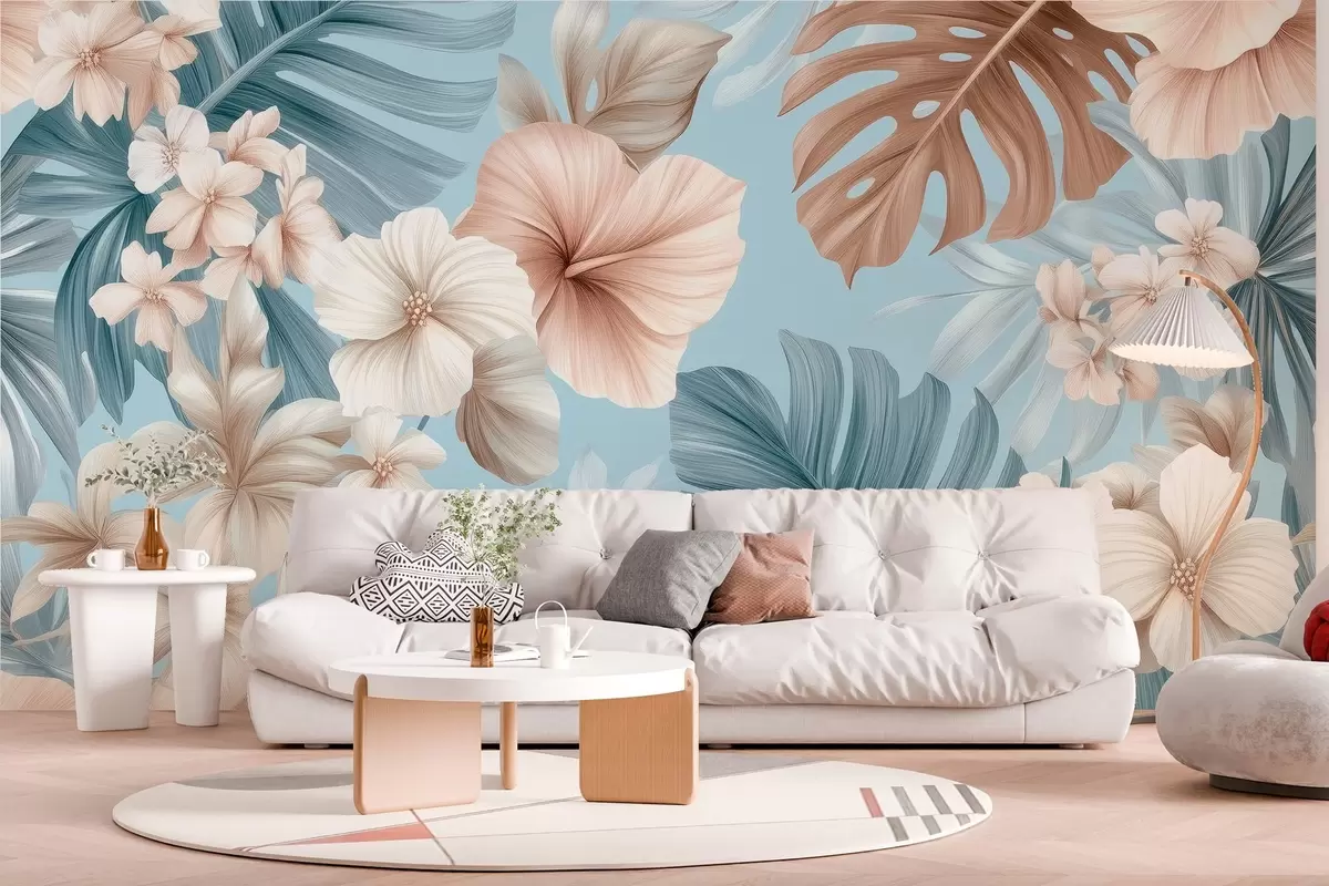 Fototapety tropický potisk s velkými listy a květy v pastelově modrých a béžových barvách Č. w03013