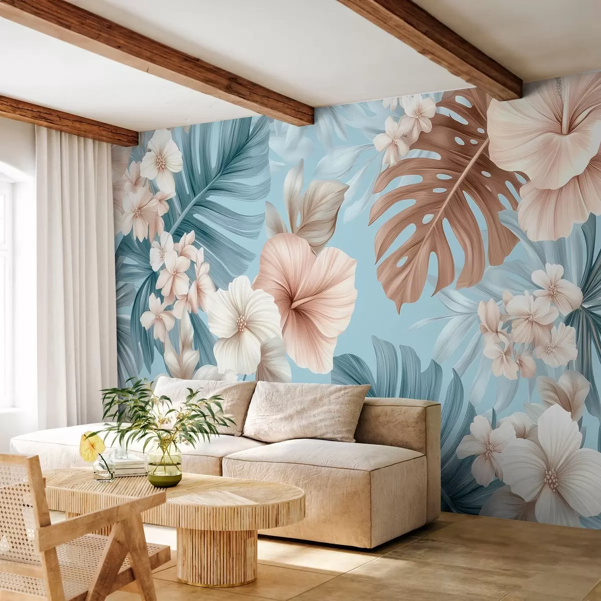 Fototapety tropický potisk s velkými listy a květy v pastelově modrých a béžových barvách Č. w03013