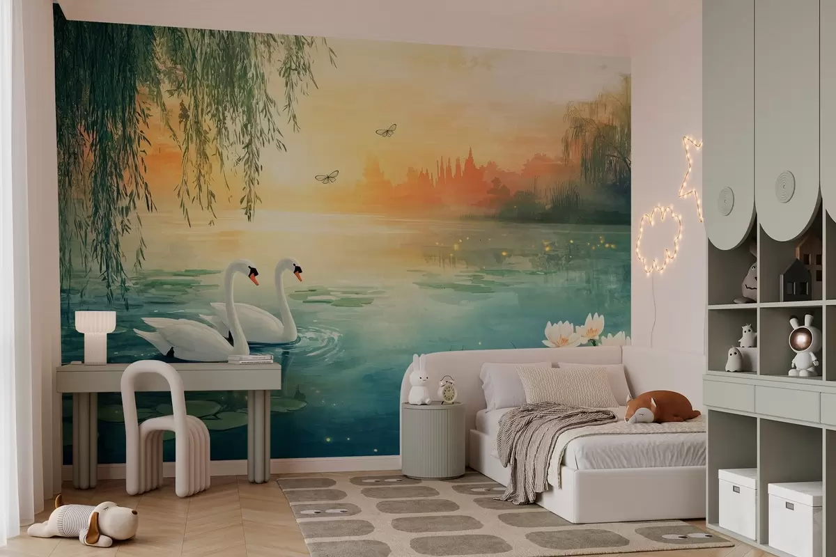Fototapety Romantická krajina ve stylu olejomalby se dvěma bílými labutěmi na jezeře Č. w03017