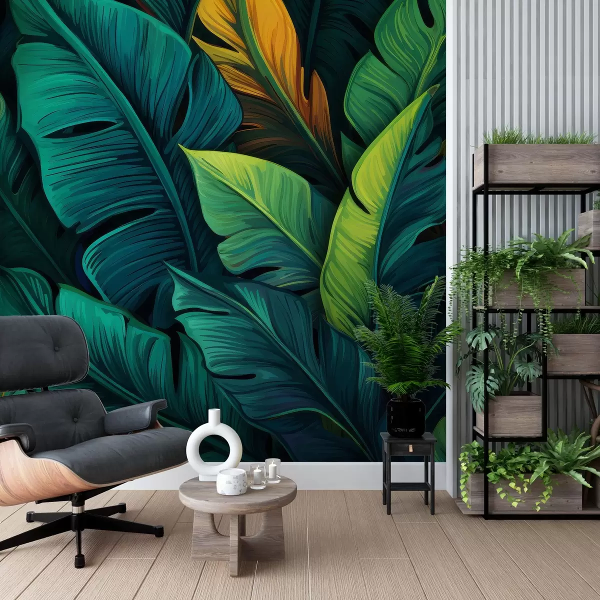 Fototapety Živé tropické listy s tmavě zelenými, modravými a oranžovými odstíny Č. w03078