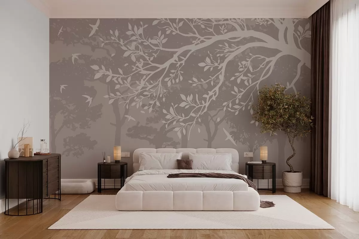 Fototapety silueta krémové větve stromu s ptáky na pozadí lesa Č. w03116