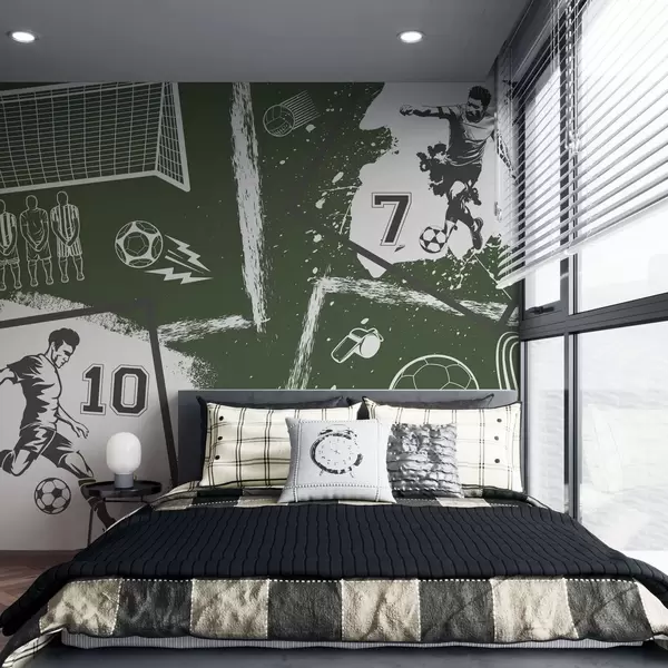 Fototapety Fotbalisté, míč a další fotbalové atributy v zelených tónech Č. w03122v2