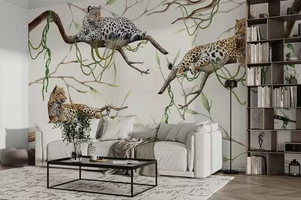 Fototapety Leopardi na stromech džungle, liány, tropické, divoká zvířata, přírodní paleta barev Č. w03146