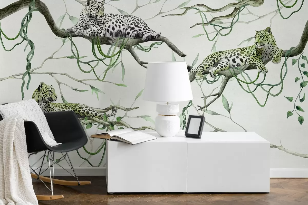 Fototapety Leopardi na stromech džungle, liány, tropické, divoká zvířata, zelená paleta barev Č. w03146v1