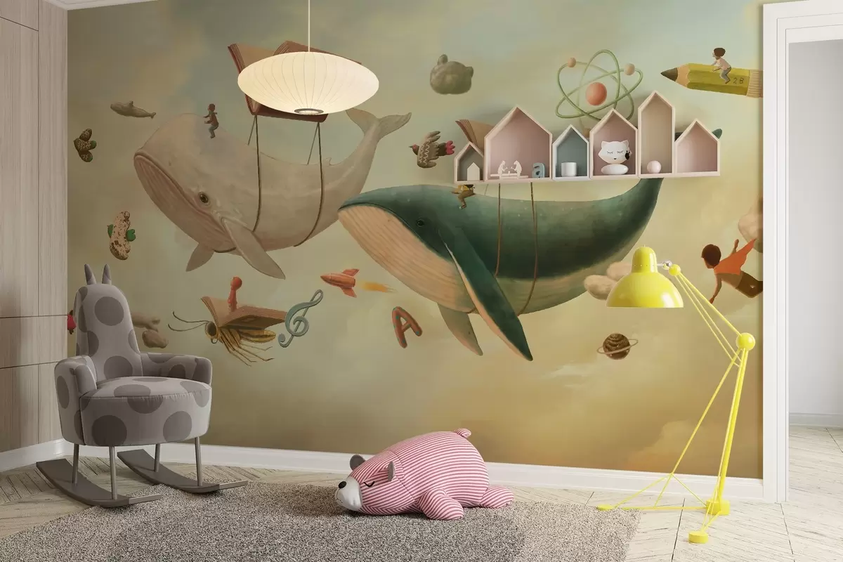 Fototapety Rozmarná ilustrace velryb létajících na obloze pod balónky ve tvaru knihy Č. w03327v1