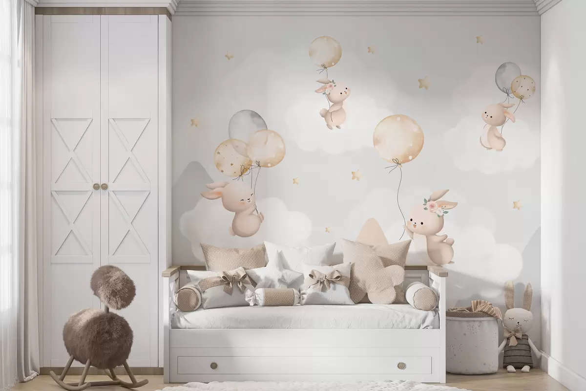 Fototapety Zajíčci s balónky na mracích mezi vrcholky hor Č. w03375v1