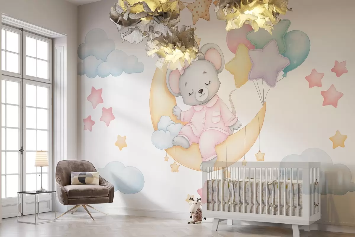 Fototapety Rozkošná ilustrace spící myšky na Měsíci, obklopené hvězdami, mraky a balónky Č. w03380