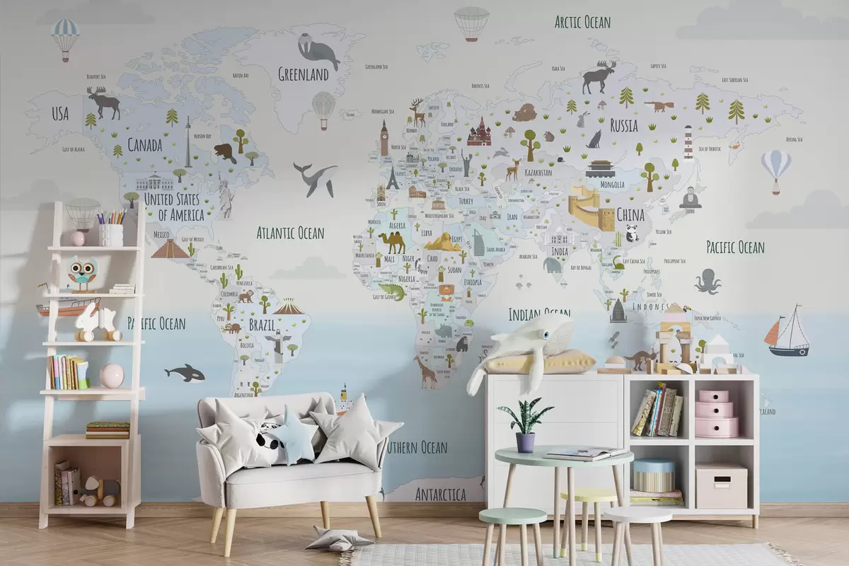 Fototapety Mapa světa se zvířaty a pamětihodnostmi Č. w03410
