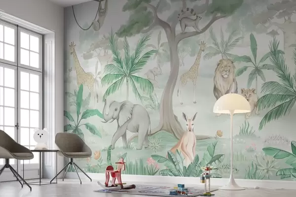 Fototapety Panorama džungle se zvířaty v zelených tónech Č. w03444v2