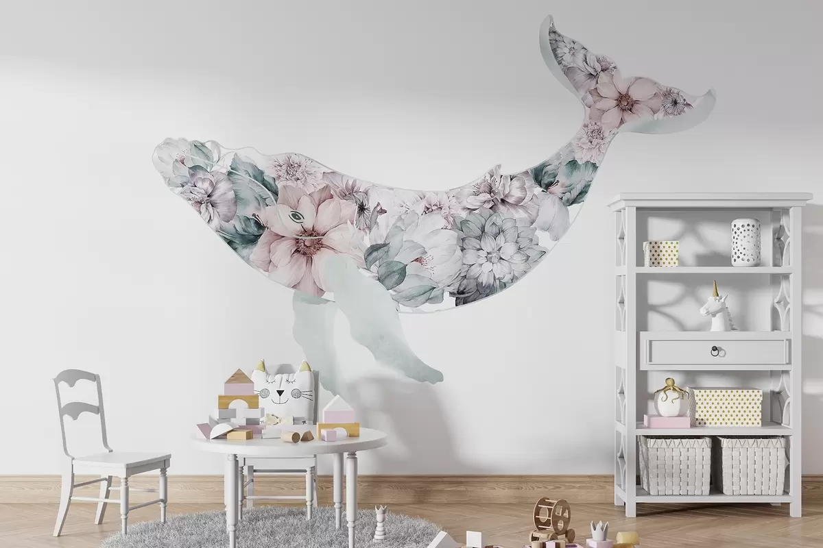 Fototapety Krásná velryba s akvarelovými květinami, mořští živočichové Č. w03445v1