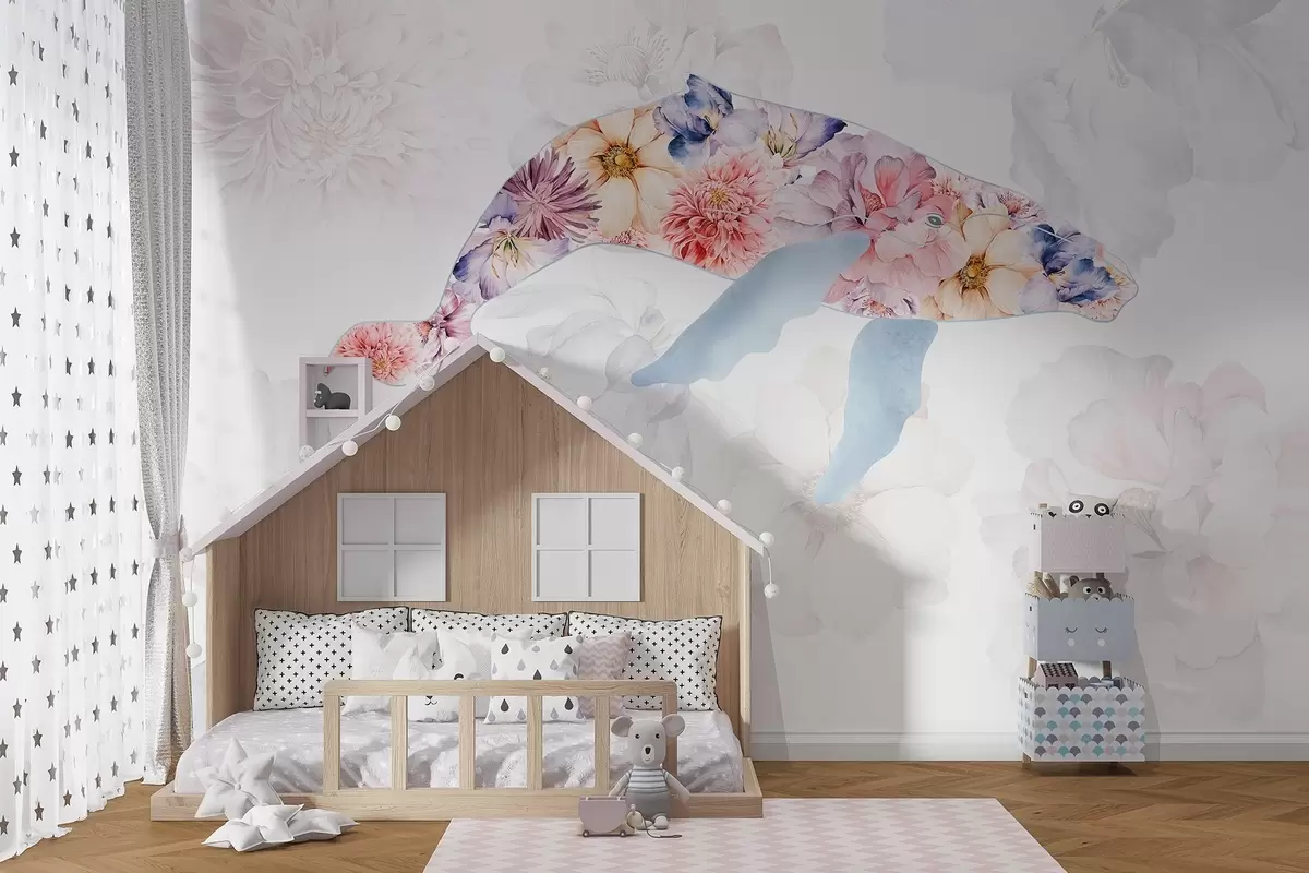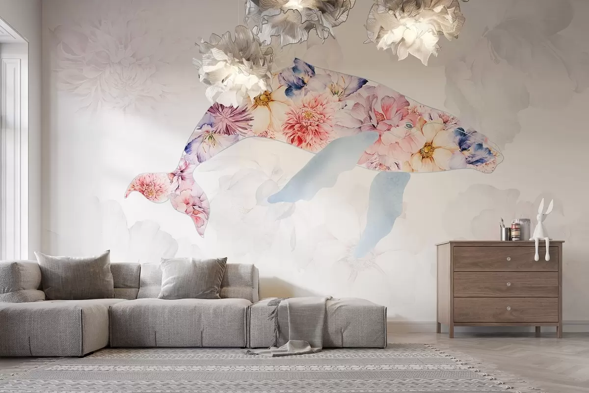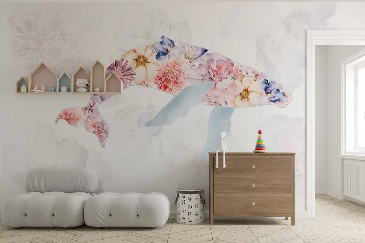 Fototapety Velryba s akvarelem květiny, oceán zvířata, minimalismus, barevné Č. w03446