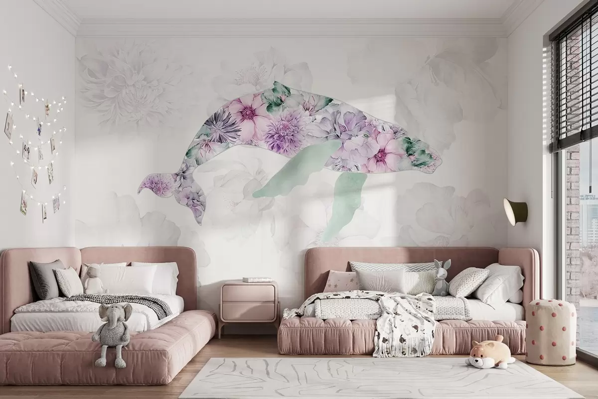 Fototapet Velryba s akvarelovými květinami, oceánská zvířata, minimalismus, růžová a zelená w03446v1