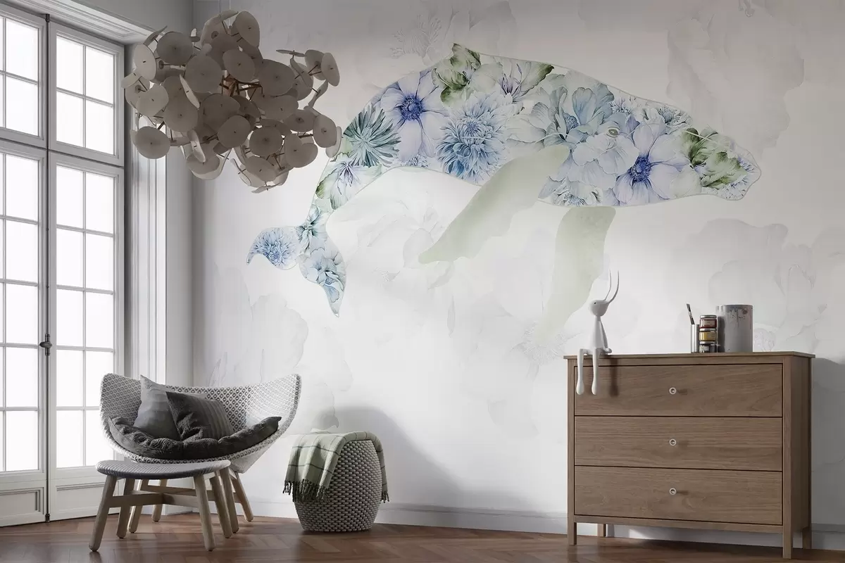 Fototapety Velryba s akvarelovými květinami, oceánská zvířata, minimalismus, modrá a zelená Č. w03446v2