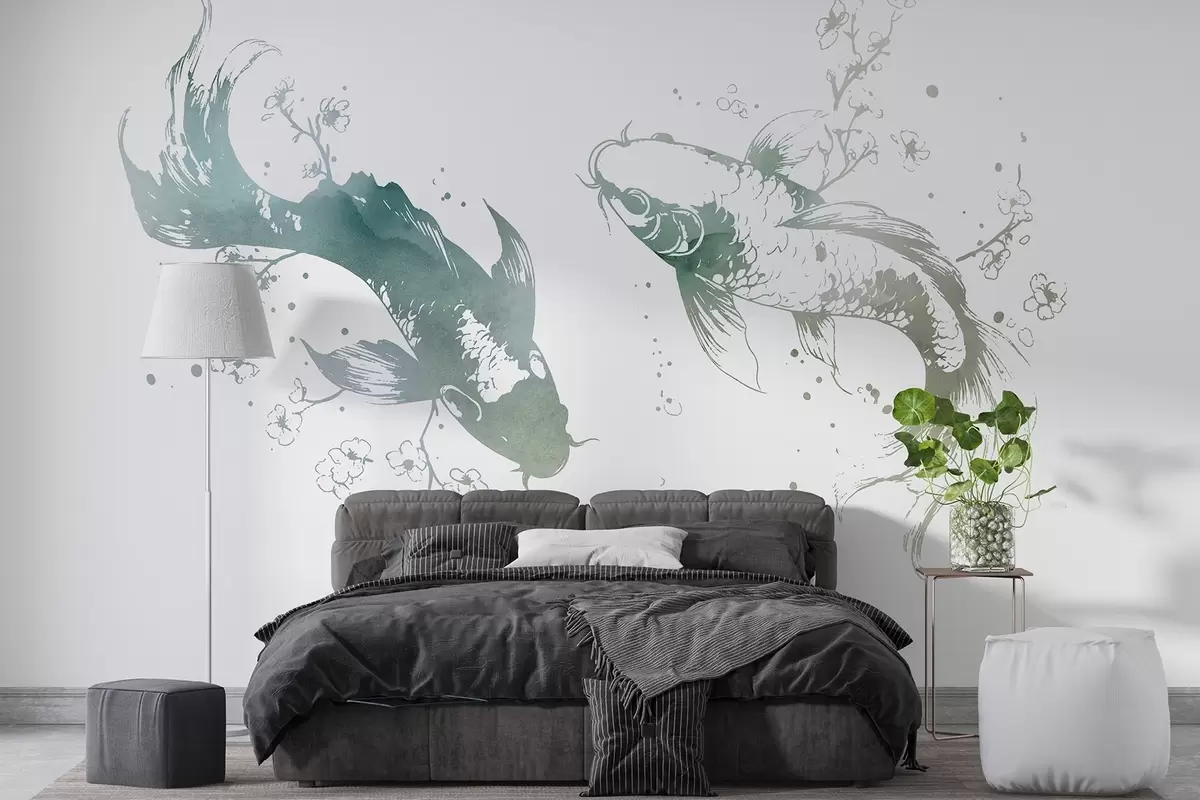 Fototapety Akvarel ryby, orientální styl, třešeň, zelené barvy Č. w03447v2