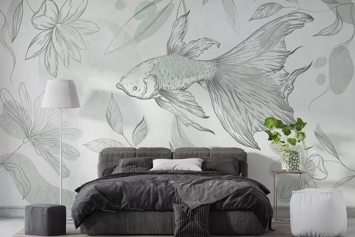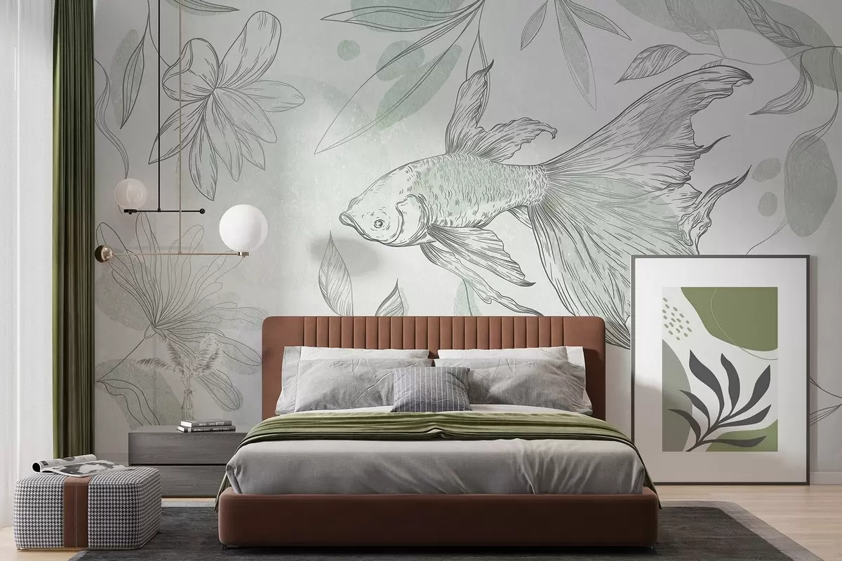Fototapety Ryba s květinovými prvky, zelené pozadí, liniová kresba Č. w03517v1