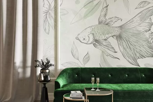 Fototapety Ryba s květinovými prvky, zelené pozadí, liniová kresba Č. w03517v1