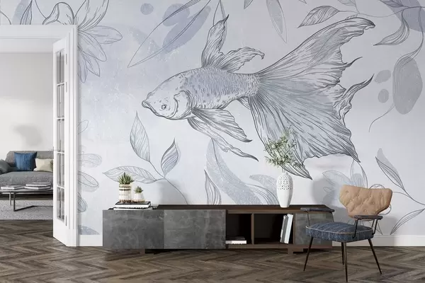 Fototapety Ryba s květinovými prvky, modré pozadí, liniová kresba Č. w03517v2