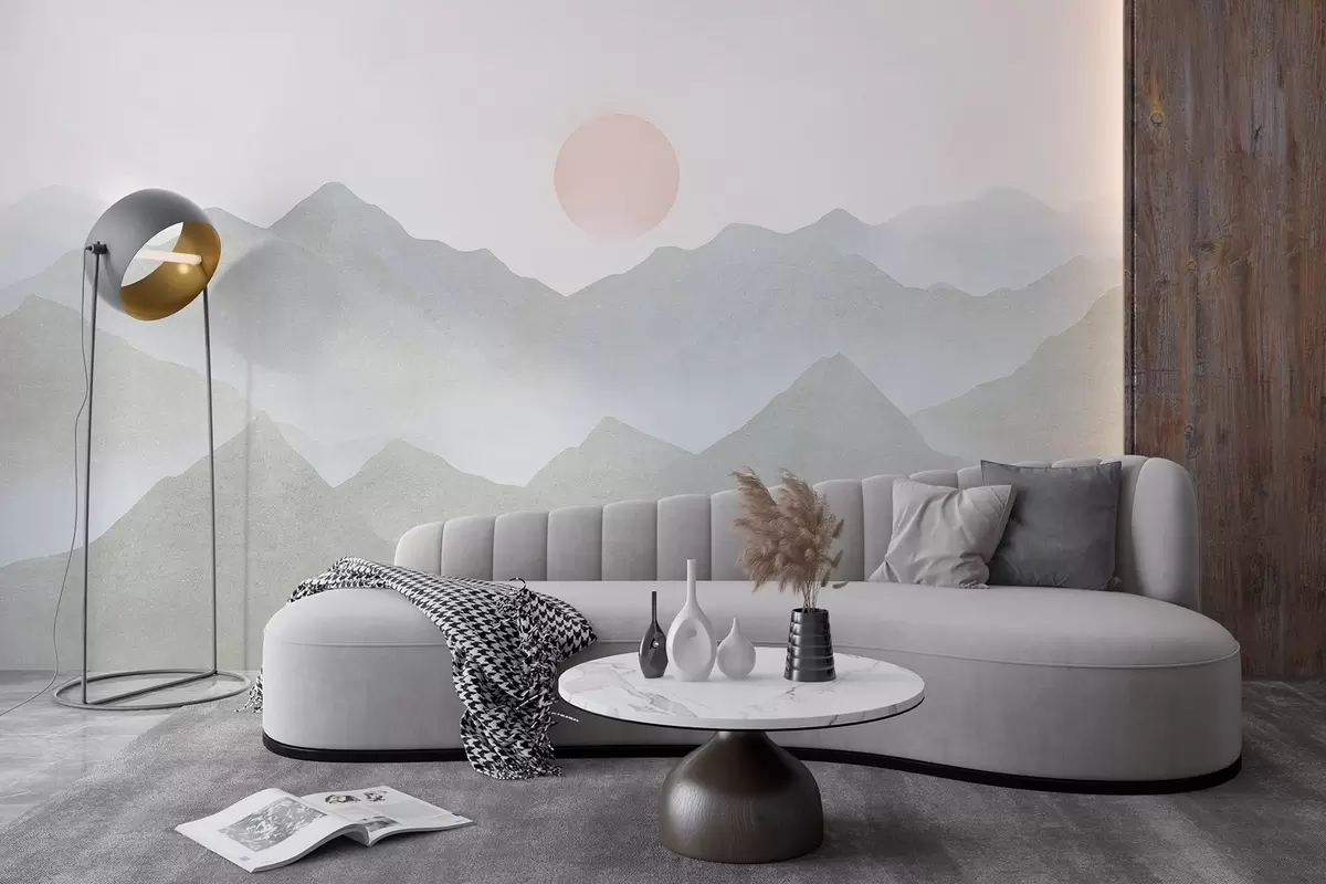 Fototapety Boho styl hory krajina, západ slunce, měkké pastelové, šedé Č. w03547v1