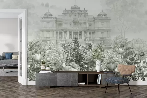 Fototapet Královský palác s pivoňkovou zahradou, akvarelový styl, příroda, zelené barvy, boho w03552v2
