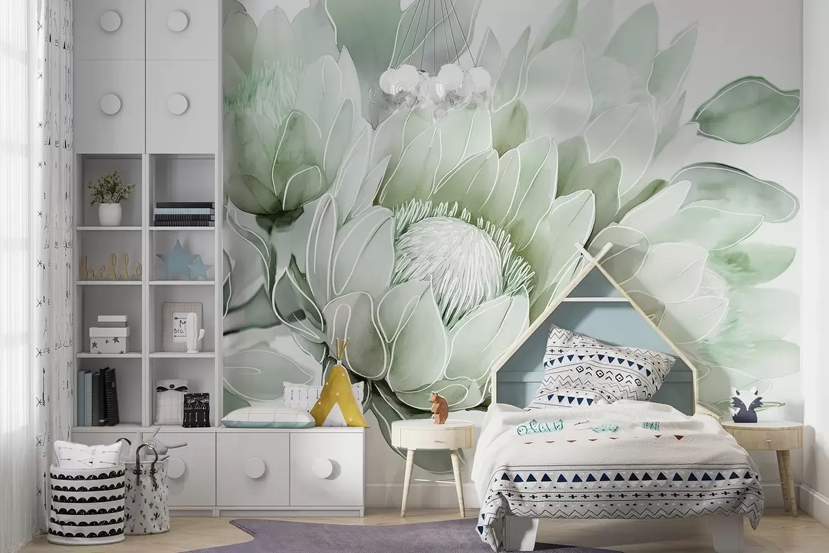 Fototapety Krásné květy protea, kresba, tropické, zelené barvy Č. w03669v2
